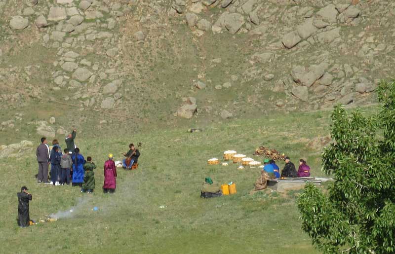 Passage à Tsetserleg surplombé par le temple de Galdan Zuu et sa statue de Boudha haute de 7m. Non loin du temple, cérémonie chamanique.