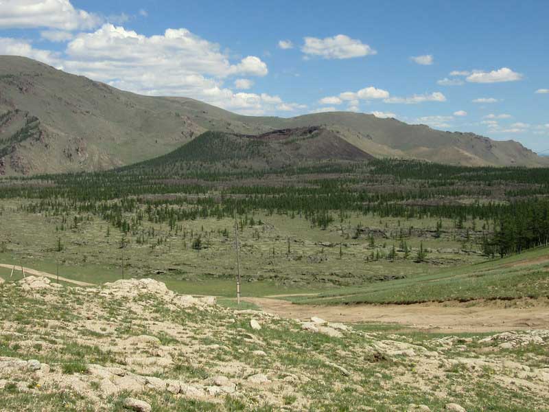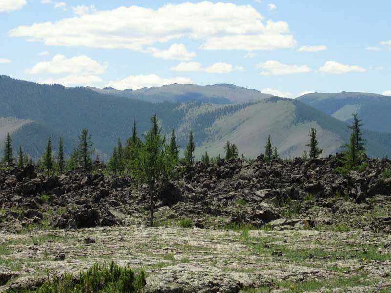 Le cône volcanique et ses champs de lave responsables de la formation du lac.