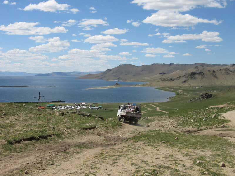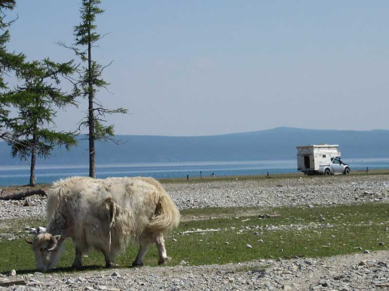 Quelques heures de piste (moyenne de 20-25 km/h) et nous arrivons au lac Hovsgol. "perle Bleue" de la mongolie, ce lac fait 136km de long et jusque 262m de profondeur, 14ème réserve d'eau douce au monde.