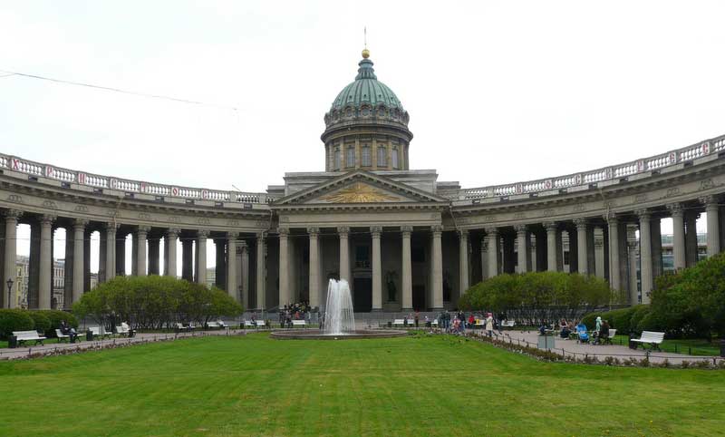 Quittant la place nous rejoignons la Pespective Nevski, artère la plus célèbre de St-Pétersbourg où se dresse la majestueuse cathédrale N-D de Kazan, avec son dôme de 90m de haut et ses 96 colonnes.