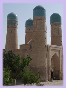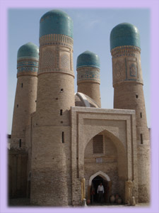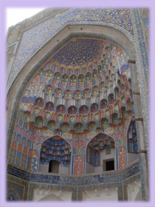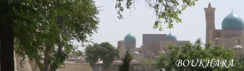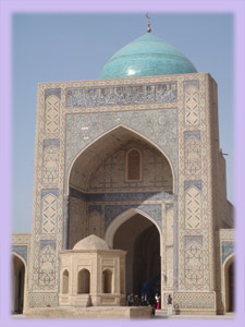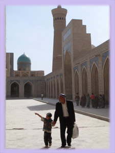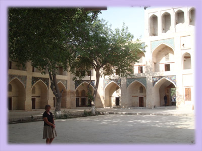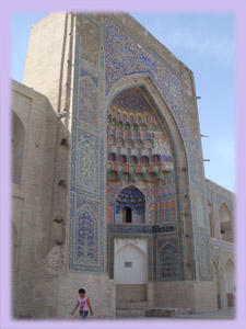 entourée de la Khanarga Nadir Divangi et de l'autre côté de la Medersa Nadir Divanbegi aux frontons décorés de 2 oiseaux fantastiques mais peu religieux.
