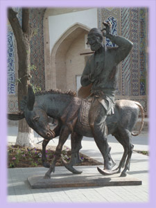 Une statue de Khodja Nasreddin monté sur son âne sépare la medersa de la Khanagha.