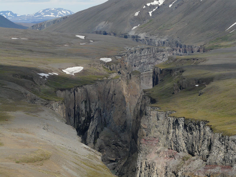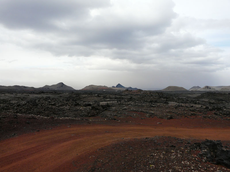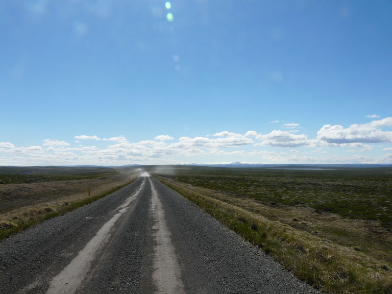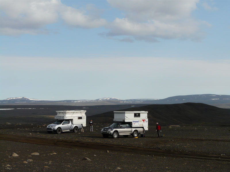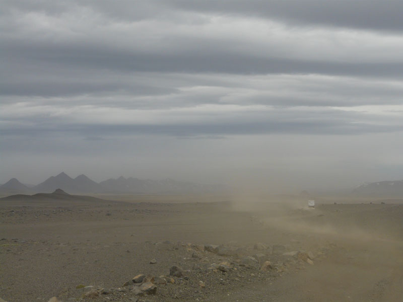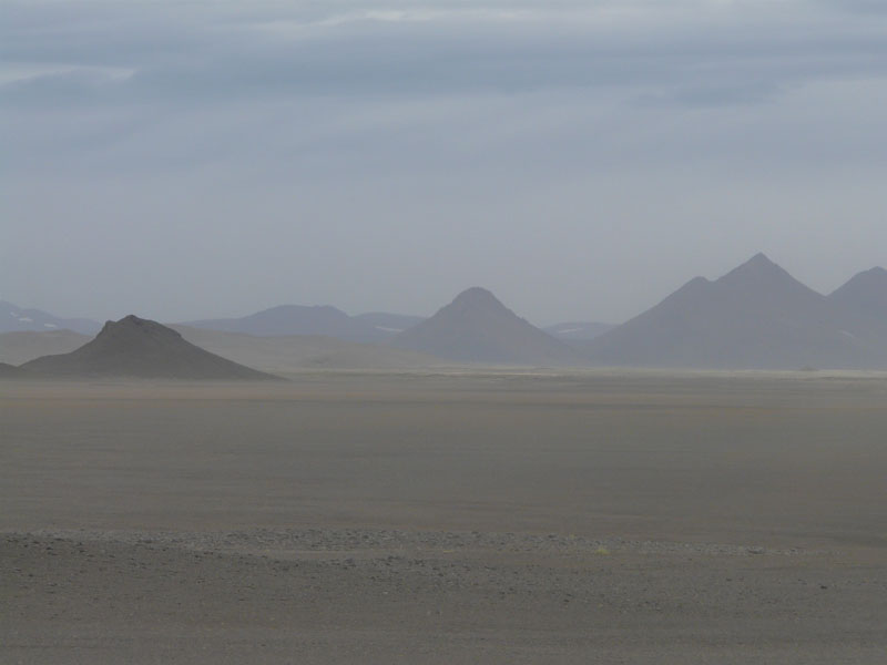 Quelques jours avant le départ, retour à Elgilsstaðir avec l'intention d'aller dans les Hautes Terres. Déception, les pistes sont encore fermées, nous décidons quand même de prendre la F910 ouverte jusqu'au barrage de Karahnjukur. Le Dieu des voyageurs est de notre côté, au moment de faire demi-tour, les responsables des pistes viennent enlever la chaîne. Nous allons découvrir ce désert minéral avec une première nuit au milieu de nulle part.