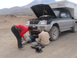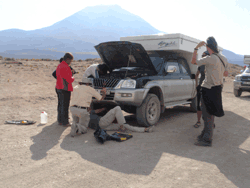 Mésentente entre les véhicules: Des antennes peu performantes et on se perd en moins de 100m. Maintenant , avec nos grandes antennes on fait "Jacky" mais l'entente cordiale est de nouveau en vigueur, reste un petit problème de micro... Contrôle de police: -Au moins une fois par jour, histoire de ne pas nous perdre de vue. Bon enfant toutefois. Pompes pour les étrangers: -Dans les villes proches du Chili, l'Argentine double le prix son carburant pour les étrangers: rageant. Véhicules: -Un moteur chauffe, le mécano enlève une pièce : problème réglé. A croire qu'il y a trop de pièces dans un moteur. -Deux crevaisons mais par chance à proximité d'une Goméria.Tarif variable de 4 à 10 pesos pour la même prestation. -La cellule d'un des véhicules ne tient plus que par 2 attaches sur 4. Frayeurs rétroactives! Nuits agitées: -La même nuit : invasion massive de coléoptères après une chasse intensive , le calme revenu, intervention de la police qui juge notre campement "no secure". Déménagement immédiat et fin de nuit sur un parking de station service très fréquentée. Douce nuit... -Surpris par la nuit à plus de 4000m , l'altitude a plus que perturbé notre sommeil. Température au réveil -8°. Histoire de surchauffe: -Acteur principal: le Mitsubishi des Trotel. -avec la participation de garagistes argentins et Boliviens et d'un chauffeur guide. Acte 1: Dans le cadre magnifique du Paso san francisco, à 4725m d'altitude, l'aiguille de température d'eau du moteur passe au rouge: l'ouverture du capot confirme la surchauffe. Acte 2: A Fiambala, village au pied du col un garagiste enlève le thermostat. ![]() Acte 3: A Salta en Argentine le concessionnaire nous confirme l'inutilité de cette pièce par temps chaud. Acte 4: A peine rentré en Bolivie à 150km de tout village, nouvelle surchauffe. Le chauffeur d'un Toyota avec touristes s'arrête et démonte le système de refroidissement sans trouver le problème.