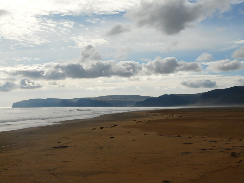 La péninsule de Snæfellsnes longue de 100km est dominée par la calotte glaciaire du Snæfellsjökull. Une plage de sable blond qui surprend dans ces paysages où la couleur noire de la lave domine.