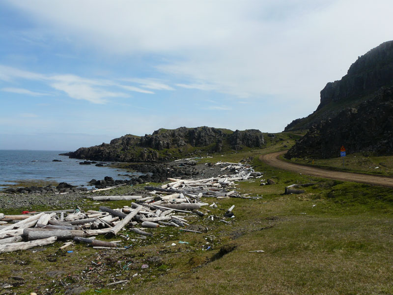 Autre côte, autre décor, le Strandir nous accueille sous le soleil avec ses nombreuses criques recouvertes de blois flotté, ressource précieuse pour ce pays où l'arbre se fait rare.