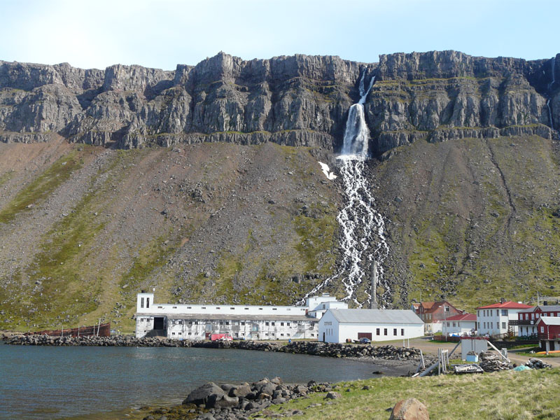 Au détour d'un virage, Djúpavik et son usine de hareng désaffectée, surplombée par une cascade. Inaugurée en 1935, elle ferma en 1954.